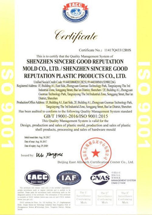 祝賀:誠好譽(yù)模具順利獲得GB/T 19001-2016/ISO 9001:2015認(rèn)證證書,認(rèn)證即信任,誠好譽(yù)將繼續(xù)努力,不負(fù)眾望,不斷創(chuàng)新產(chǎn)品,提高產(chǎn)品質(zhì)量的同時(shí),也把服務(wù)做好,把模具產(chǎn)品做得越來越好的!
